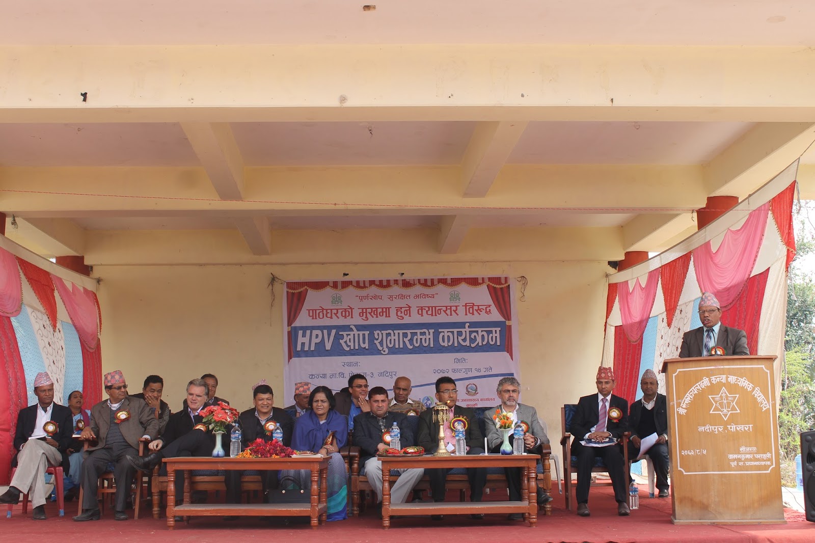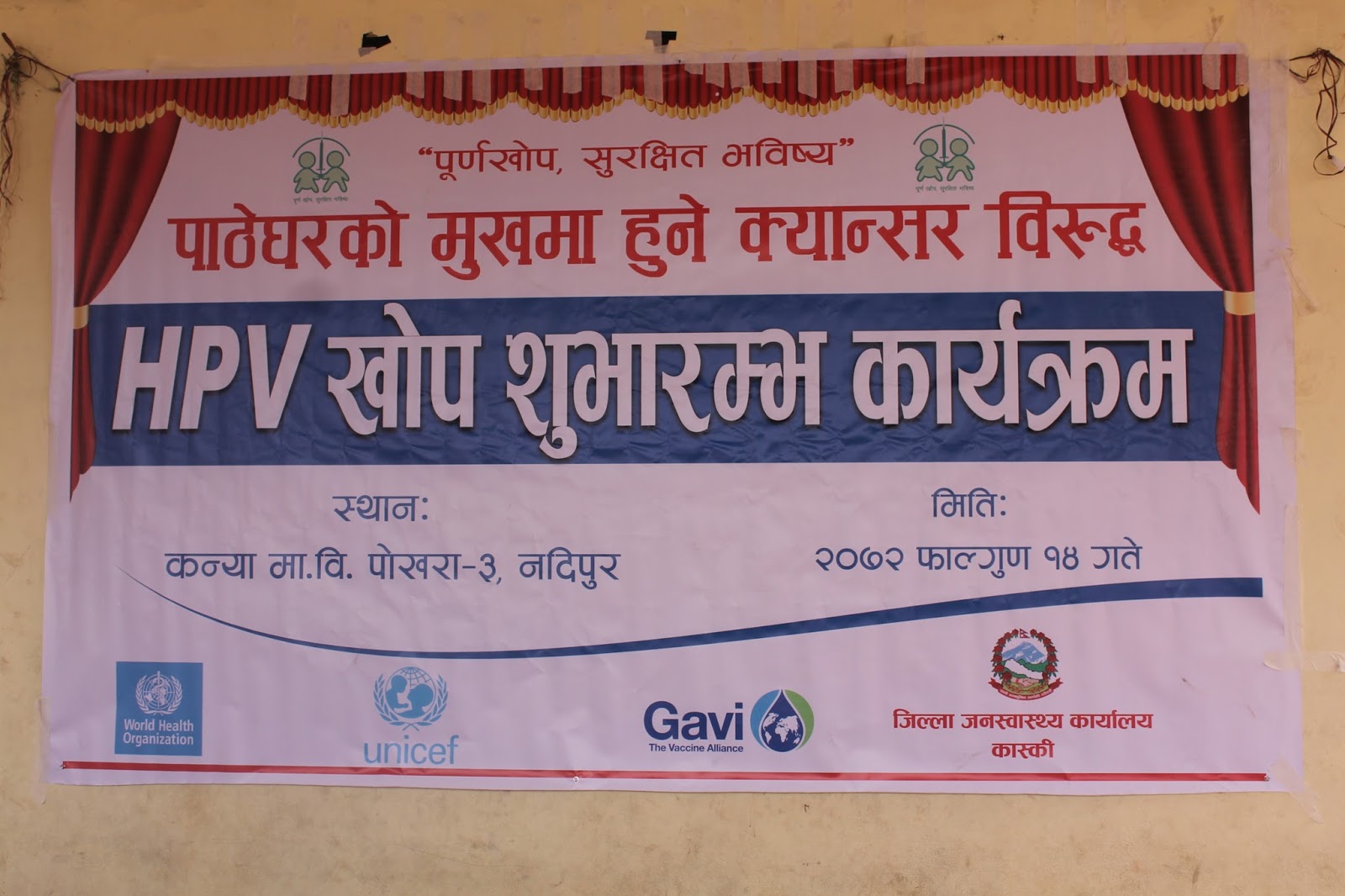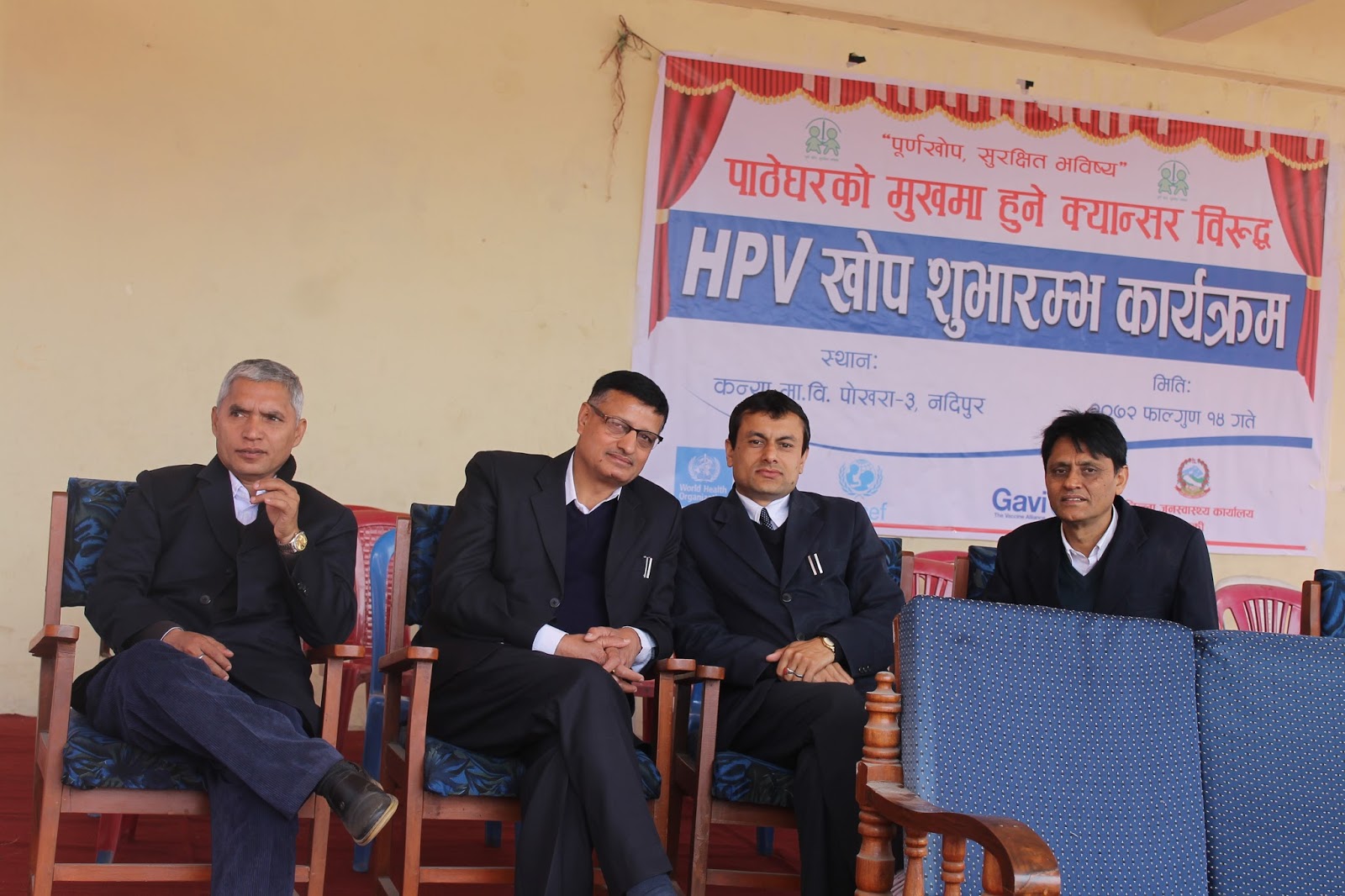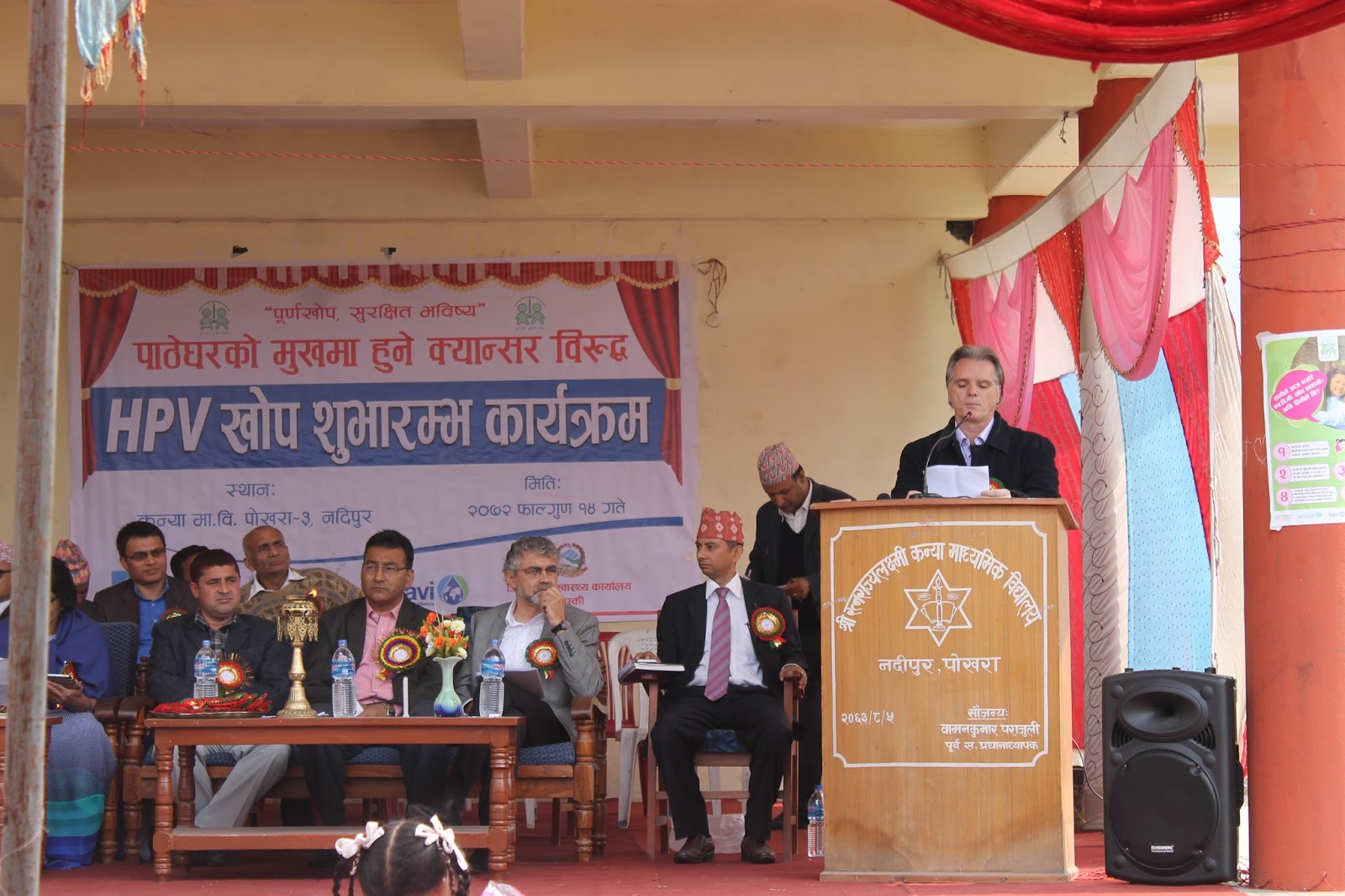 HPV Vaccination program as the latest pilot project (covering Chitwan and Kaski district) to prevent cervical cancer has begun here today from Pokhara, Kaski. This has become possible due to the joint initiative of Child Health Division and Family Health Division under Department of Health Services. Mr. Shanta Bahadur Shrestha, Secretary from MoH formally inaugurated the program today from Kanya Secondary School, Nadipur, Pokhara. Meanwhile, Director General of DoHS Dr. Pushpa Chaudhary handed over the vaccine carrier with HPV vaccine to health worker for starting the campaign. Preshila Paija, 10 year girl studying in class six at the school was the first one to receive first HPV Vaccine in Nepal. This vaccine completes in two doses administered at the interval of six months. The program has targeted to immunize nearly 15,000 school girls studying in Grade VI or non-school girls of age 10 years from Chitwan and Kaski district.